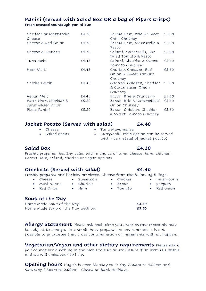 From the moment you step inside, you are greeted by a welcoming ambiance that complements the delightful menu. With a keen focus on quality and affordability, Hugo's presents a varied selection of drinks and snacks that cater to both quick bites and leisurely coffee breaks. Sip on a rich Cappuccino (£2.65) or a smooth Flat White (£2.25) as the baristas craft each drink with precision and care, ensuring every cup is a delight.